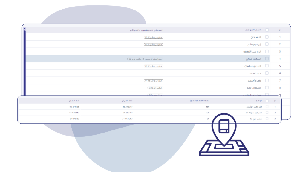 إدارة مواقع عمل والفروع للمنشأة و تحديد أماكن عمل الموظفين لمتابعة عملية الحضور و الانصراف للموظف بناءً على مكان عمله.