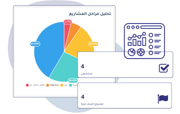 لوحة مؤشرات توضح مسارات العمل على المشاريع و المعلومات بشكل عام لتعطي تصور كامل على المشاريع و مراحل التنفيذ .